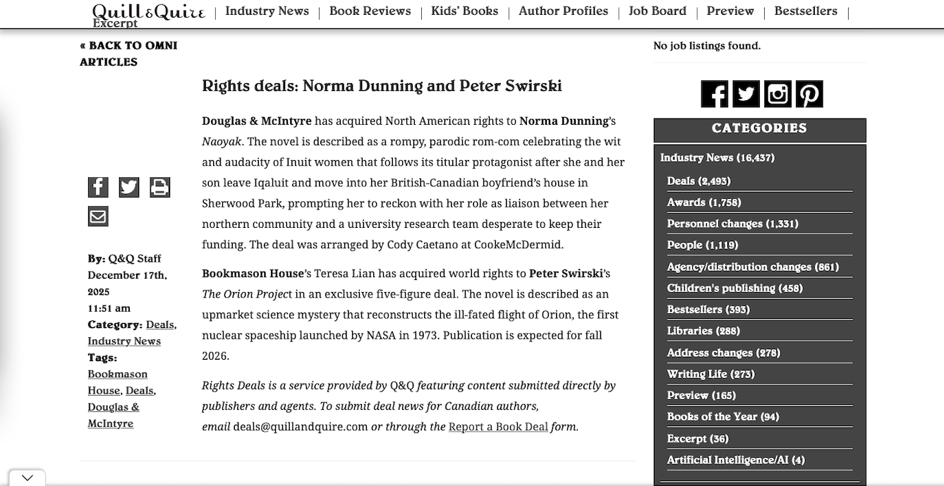 BOOKMASON HOUSE is happy to announce its first acquisition: THE ORION PROJECT by Peter Swirski (https://en.wikipedia.org/wiki/Peter_Swirski) in an exclusive five-figure deal. This upmarket science mystery reconstructs the ill-fated flight of Orion, the first nuclear spaceship launched by NASA in 1973. The book is set to be out in Fall 2026.